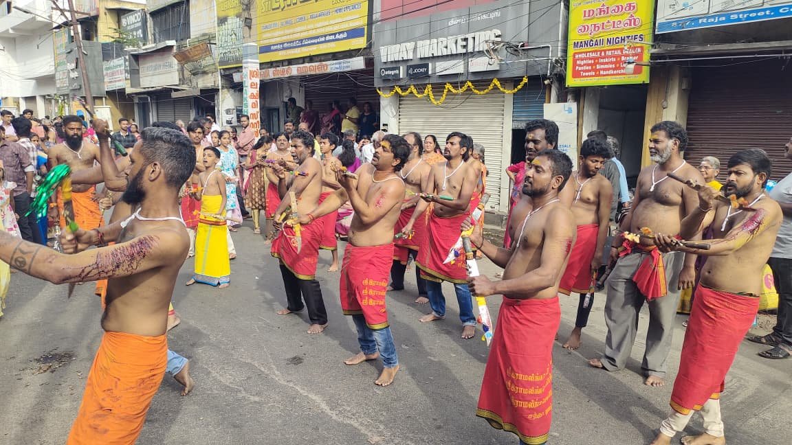 பூமார்க்கெட்டில் உள்ள மாகாளியம்மன் கோவிலில் இருந்து தொடங்கிய ஊர்வலம், இசை முழக்கத்துடன் ஆடிப்பாடி சவுடேஸ்வரி அம்மன் கோவிலை நோக்கி வந்தது. இதில் கலந்து கொண்ட பக்தர்கள் “வேசுக்கோ, தீசுக்கோ” என பாடிக் கொண்டும், ஆடிக்கொண்டும், கத்தியை கைகளில் வெட்டிக் கொண்டு தங்களது பக்தியை வெளிப்படுத்தினர்.