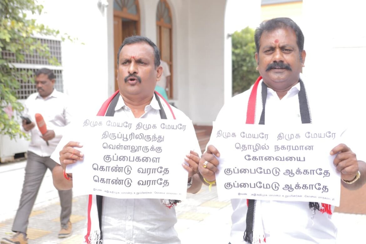 கோவை மாநகராட்சியின் சாதாரண கூட்டம் மாநகராட்சி பிரதான அலுவலகத்தில் இன்று நடைபெற்றது. இதில் அதிமுக மாமன்ற குழு தலைவர் ஆர். பிரபாகர் மற்றும் மாமன்ற உறுப்பினர் ரமேஷ், திருப்பூரிலிருந்து கோவை வெள்ளலூர் குப்பை கிடங்கிற்கு குப்பைகளை கொண்டு வருவதை எதிர்த்து, பதாகைகளை ஏந்தி கோசம் எழுப்பியதால் கூட்டத்தில் பரபரப்பு நிலவியது.