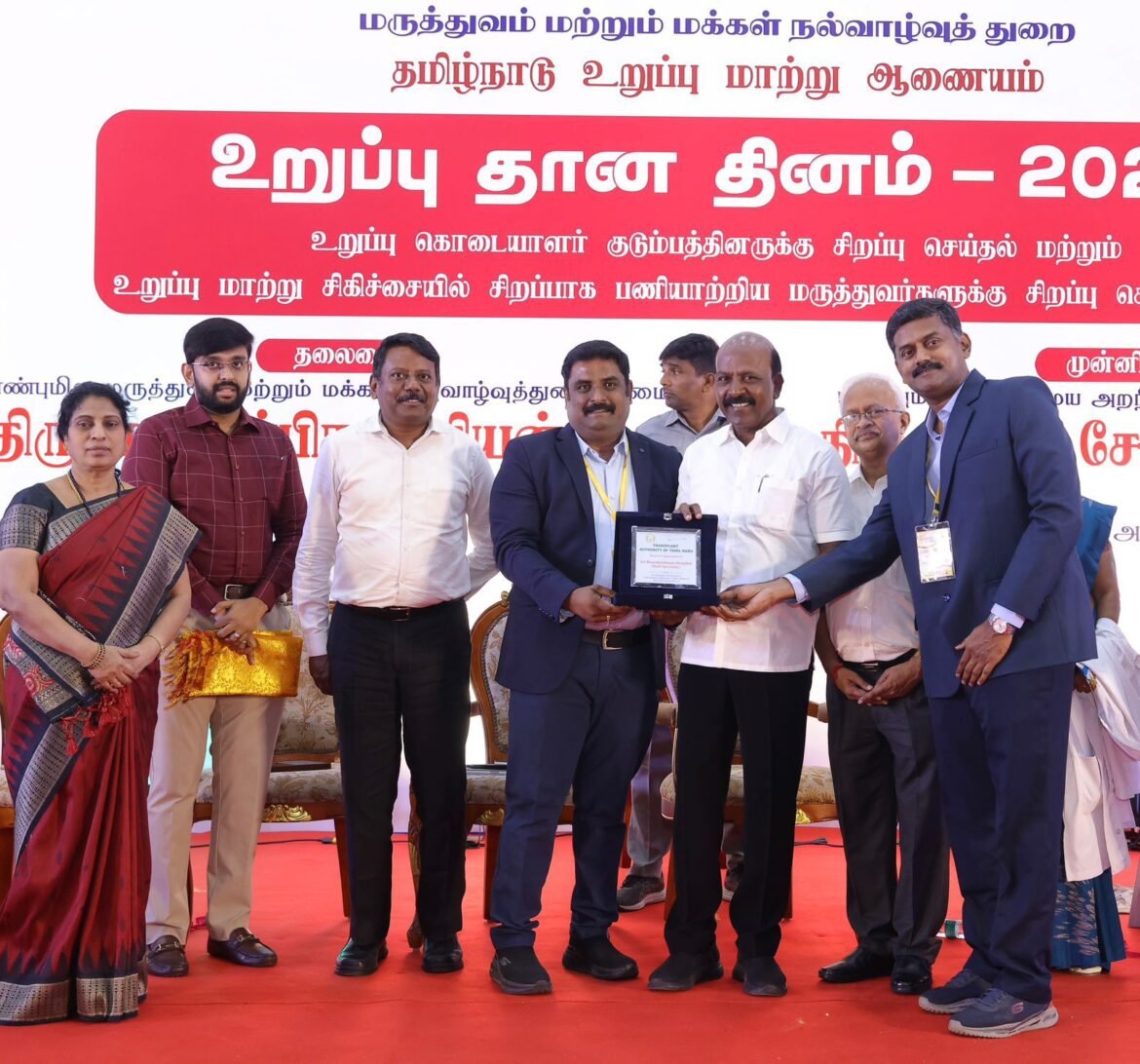 The award, presented by Ma. Subramanian, Minister for Health and Family Welfare, acknowledges the hospital’s outstanding role in the Deceased Donor Programme for 2024–25. The event also celebrated donor families, transplant experts, coordinators, and hospitals that have significantly advanced the cause of organ donation across Tamil Nadu.